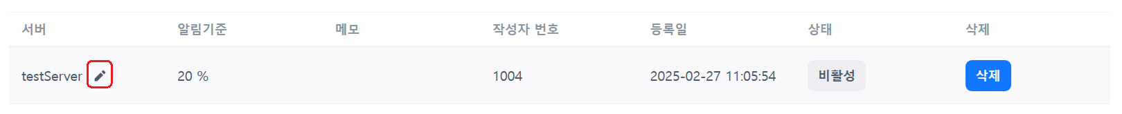 - 알림 설정 리스트의 서버명에 마우스 오버 시 수정 버튼이 나타납니다.
