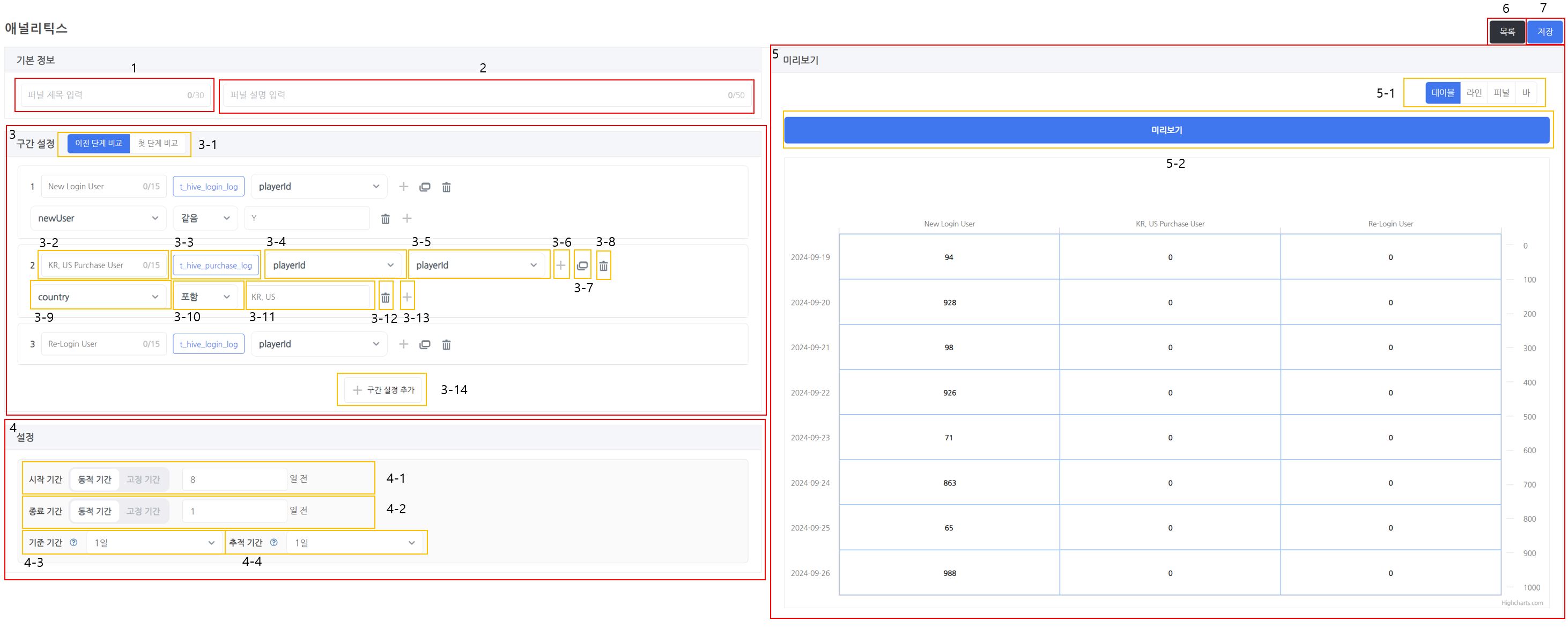 - 입력된 구간 설정 정보와 설정 정보로 생성되는 퍼널을 미리 확인할 수 있습니다.