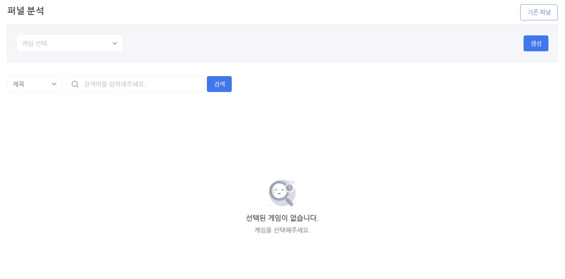 - 퍼널을 조회하거나 생성하기 위해 게임 선택을 필수적으로 해야합니다. 게임을 선택하면 해당 게임에 생성된 퍼널을 확인할 수 있고, 새로운 퍼널을 생성할 수 있습니다.