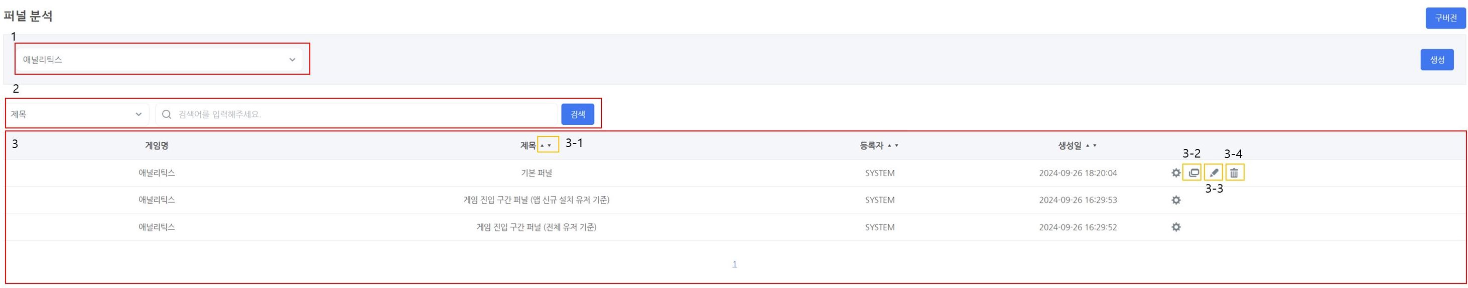- 제목, 등록자, 생성일 옆의 아이콘을 누르면 정렬이됩니다. 기본 정렬 순서 : 생성일 기준 내림차순 적용. 단, 즐겨찾기 적용된 퍼널은 우선 노출됩니다.