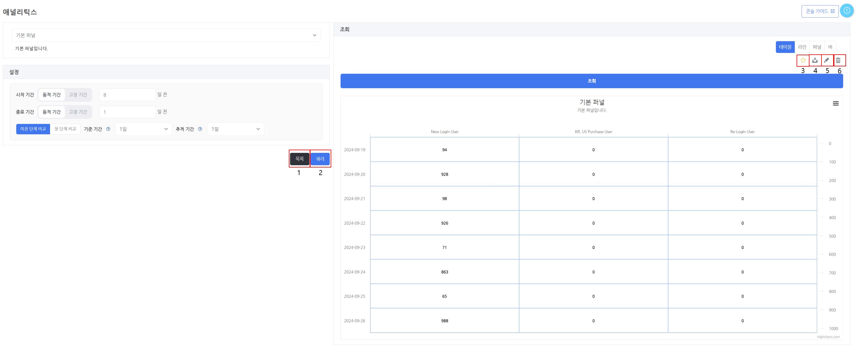 - 테이블, 라인, 퍼널, 바 차트