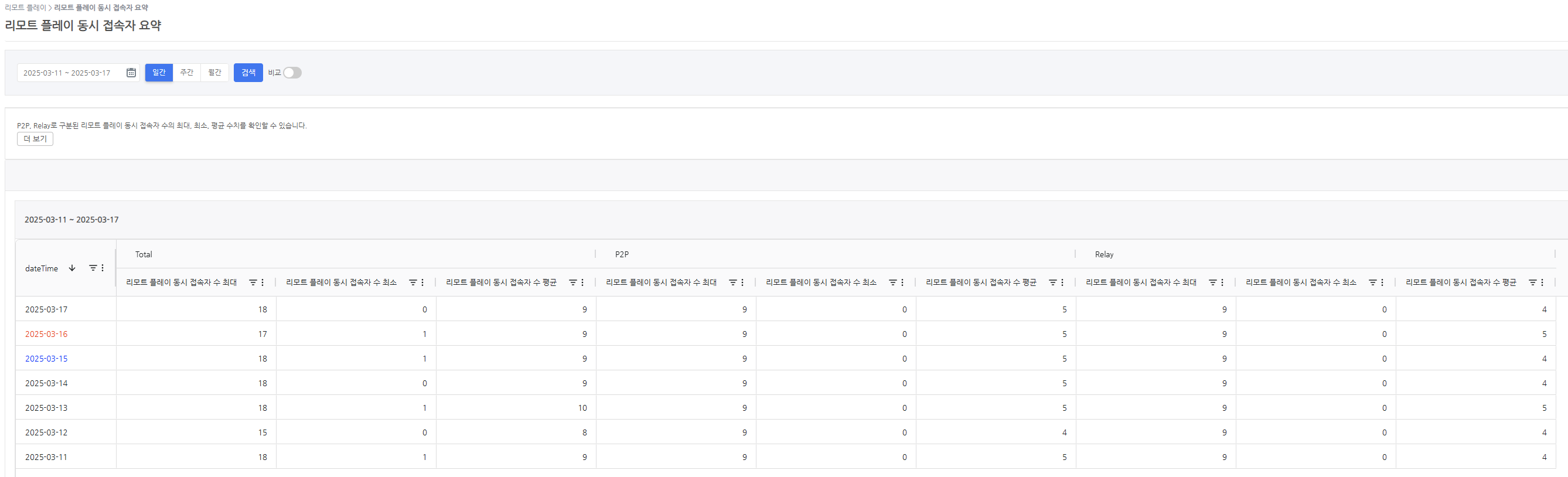 - P2P, Relay로 구분된 리모트 플레이 동시 접속자 수의 최대, 최소, 평균 수치를 일간/주간/월간으로 제공합니다.