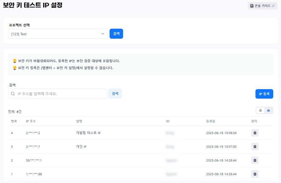 생성한 보안 키는 사용 전에 테스트할 수 있습니다. [앱센터 > 보안 키 테스트 IP 설정] 메뉴에서 IP를 등록하면, 해당 IP에서는 보안 키가 비활성화된 상태에서도 보안 키를 통한 통신이 가능합니다. 등록한 IP 주소는 프로젝트 단위로 관리됩니다.