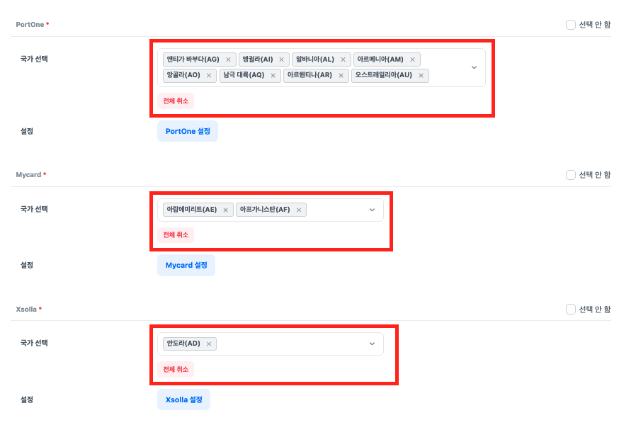 - 예시: PortOne 서비스 국가를 ‘대한민국(KR)’ 선택 -> Mycard, Xsolla에서 ‘대한민국(KR)’ 선택 불가