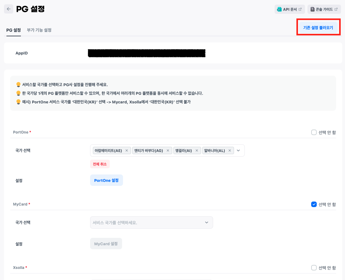PG 설정 중 다른 AppID의 정보를 참고하거나 적용하려면 기존 설정 불러오기 기능을 사용하세요.
