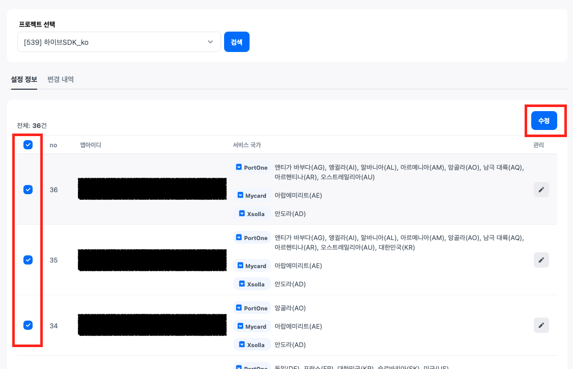 - 선택한 모든 AppID에 동일한 PG 정보를 적용하려면, 원하는 AppID를 선택한 뒤 수정 버튼을 클릭해 주세요.