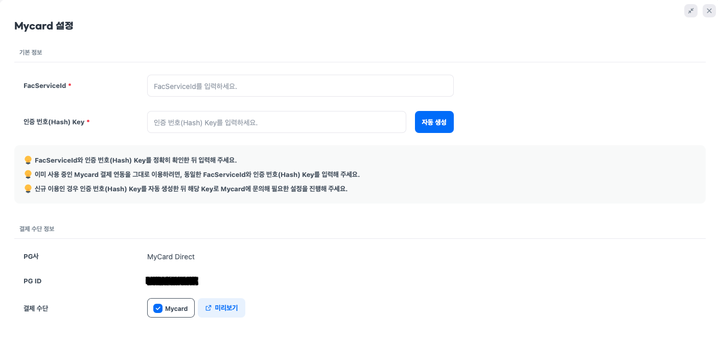 - MyCard에 이미 등록된 인증 번호(Hash) Key를 사용하려면, 해당 값을 그대로 입력하면 됩니다.