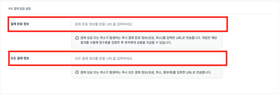 - 모든 결제 정보 : 결제 성공 또는 취소가 발생하는 즉시 모든 결제 정보(성공, 취소, 환불 유저 재결제)를 입력한 URL로 전송합니다.