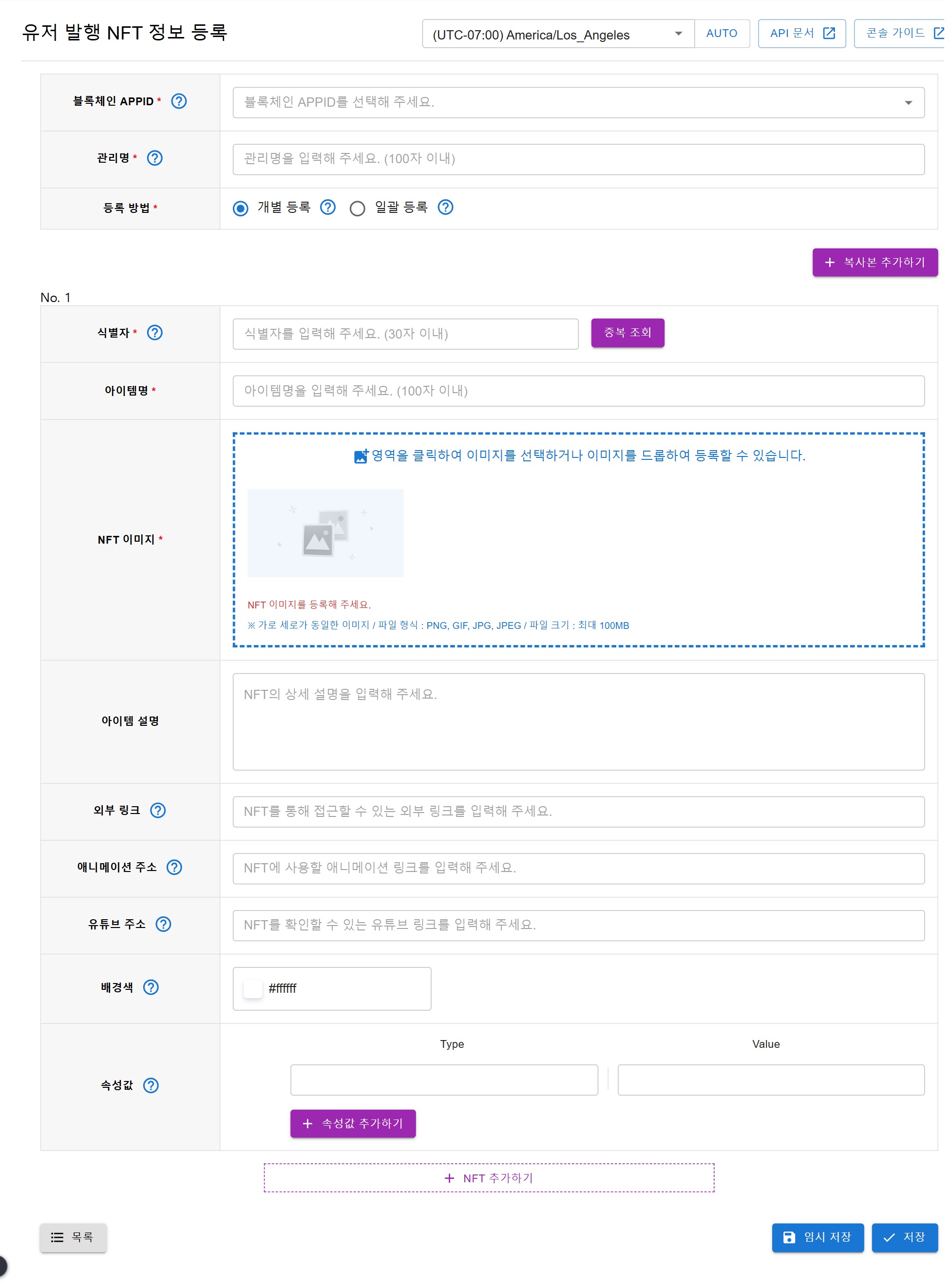 - 개별 등록 : NFT 상세 정보를 1개씩 개별 등록합니다.