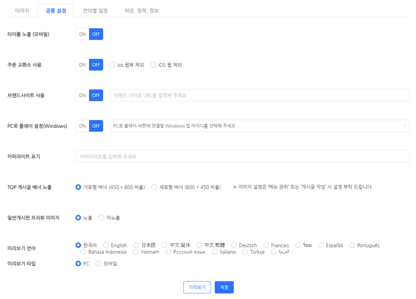커뮤니티 메인에 노출되는 이미지 에셋을 등록하거나 기능을 설정합니다. 메인 페이지 요소인 타이틀, SNS 아이콘 등은 사용하는 사이트 언어별로 등록할 수 있습니다.