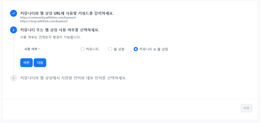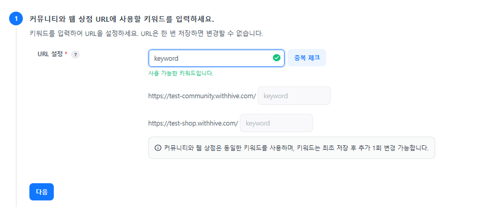 커뮤니티와 웹 상점 URL에 사용할 키워드를 입력하세요. 커뮤니티와 웹 상점은 동일한 키워드를 사용하며, 키워드는 최초 저장 후 1회 변경 가능합니다.