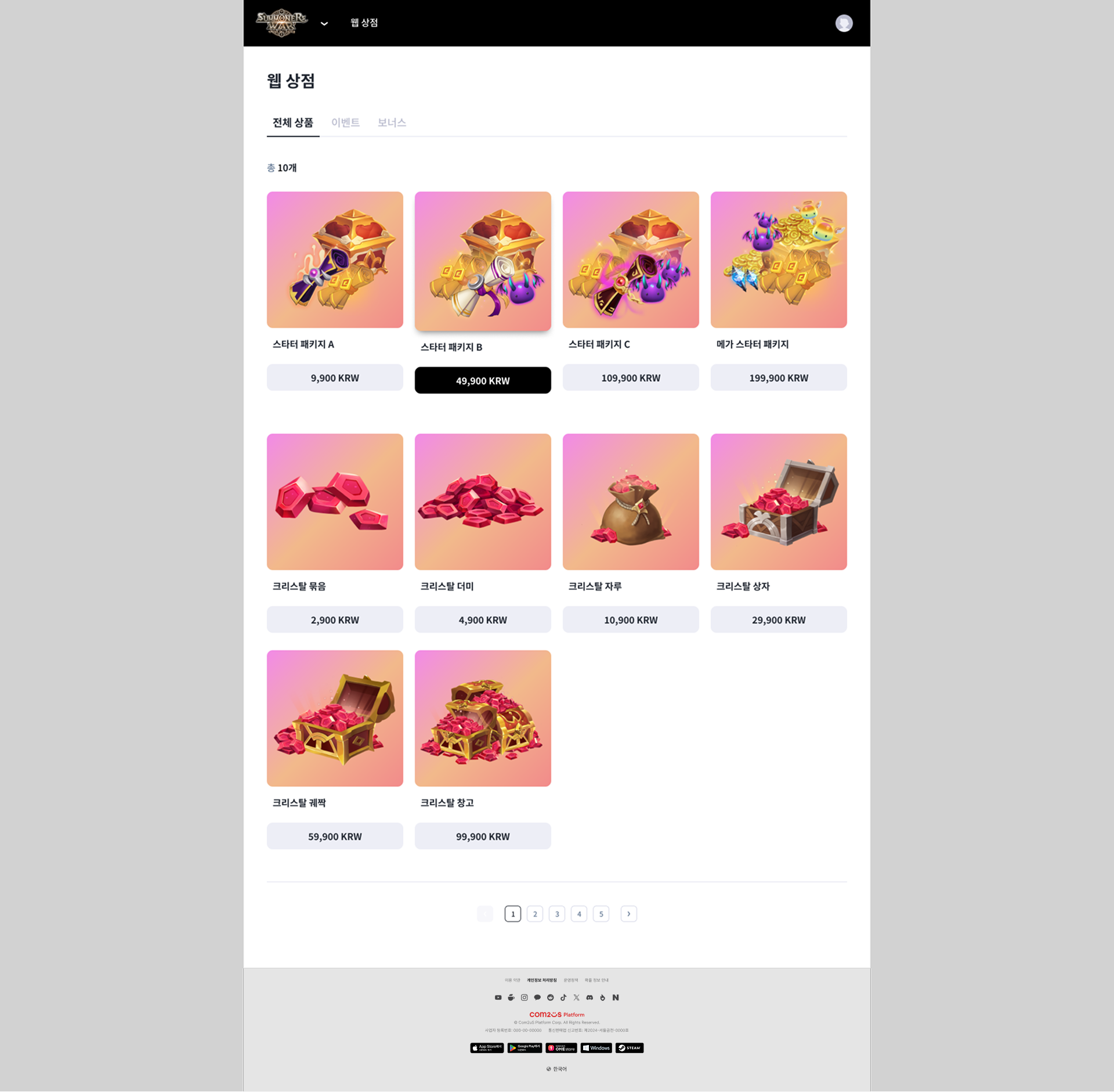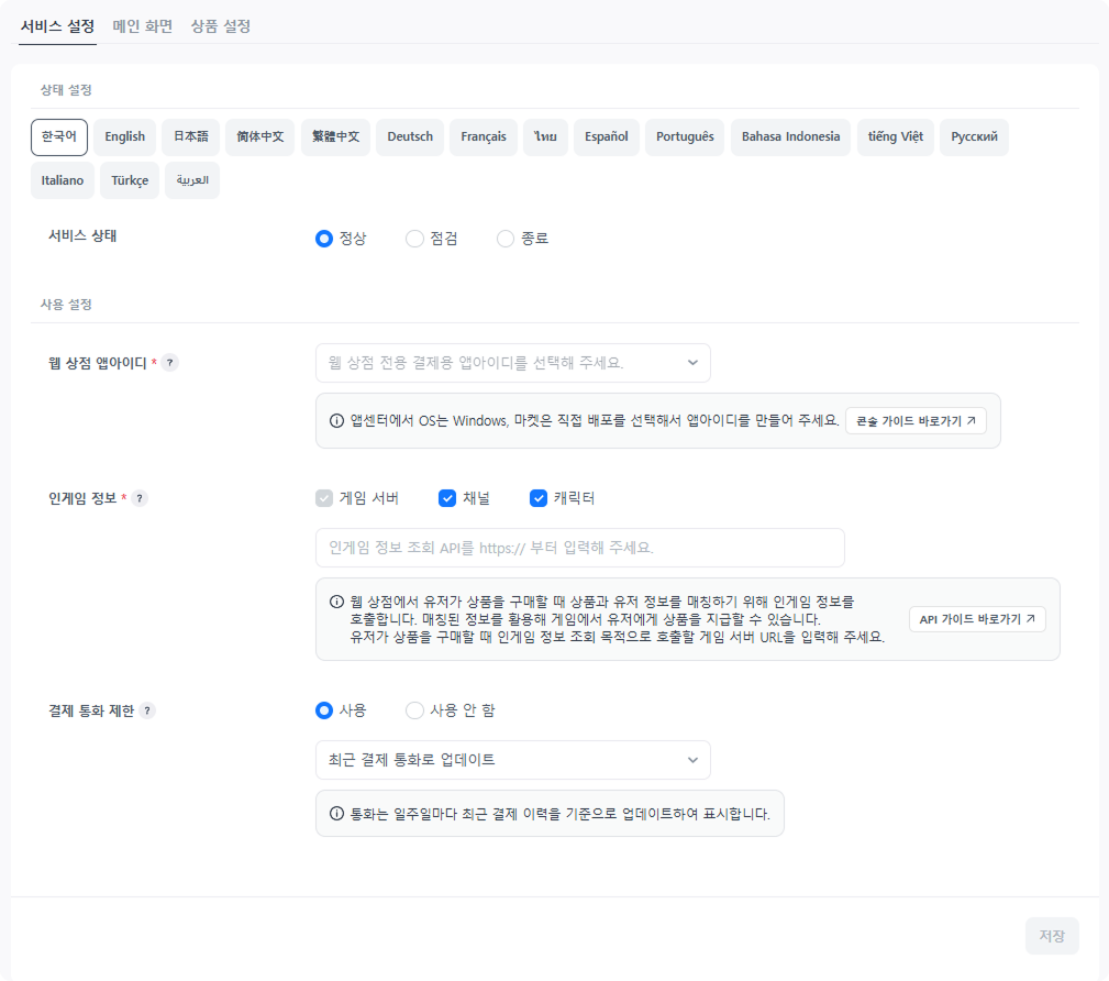 웹에서 상품을 사고 팔 수 있는 웹 상점을 설정합니다. 게임은 웹 상점과 빌링 기능을 이용하여 웹 상점에서 판매할 상품을 등록할 수 있습니다.