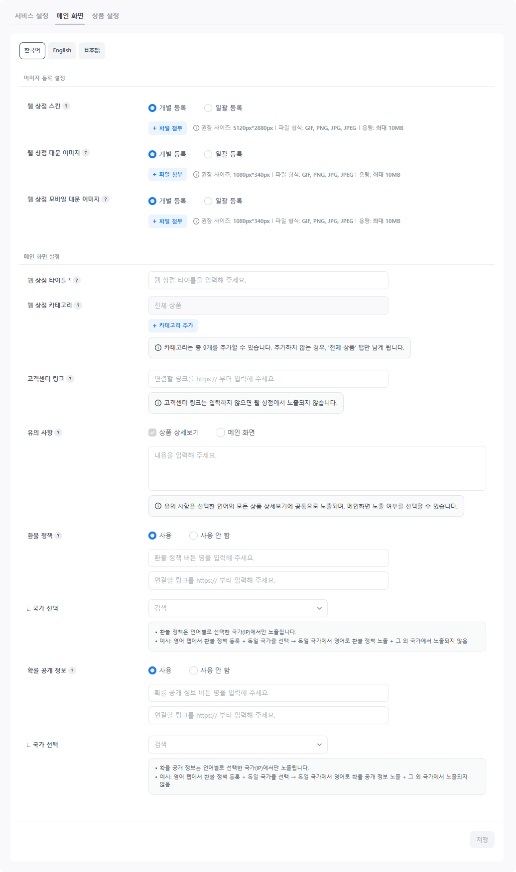 웹 상점 메인에 노출되는 이미지 에셋을 등록하거나 기능을 설정합니다. 언어별로 등록 가능하며, 이미지는 일괄 등록 기능을 사용하여 빠르게 등록할 수 있습니다.
