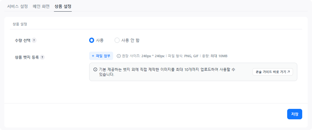 상품 구매 시, 상품 수량 선택 기능 제공 여부를 선택할 수 있습니다. 사용하는 경우 고객이 수량을 - /+ 버튼을 통해 선택하여 구매할 수 있고, 사용하지 않는 경우 1개씩만 구매할 수 있습니다.