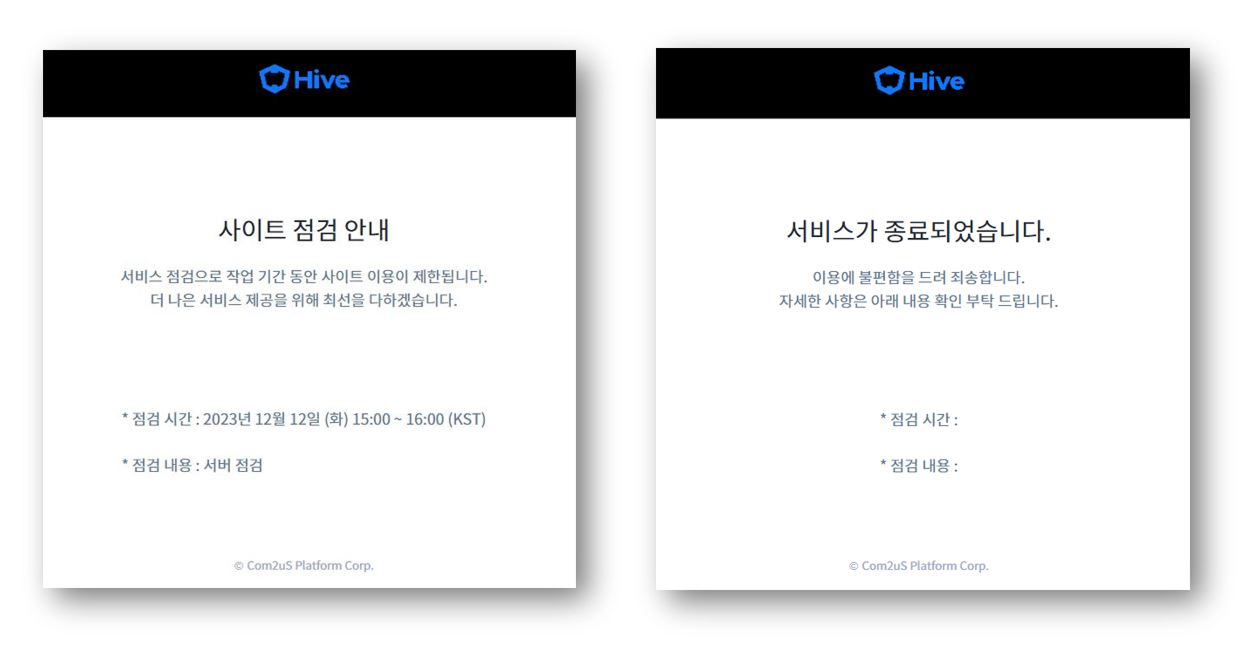 - 점검과 종료 페이지의 차이는 메인 문구만 다르며 나머지 기능은 동일합니다.