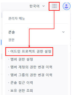 - 어드민 → 멤버 역할 변경 시 : 어드민 권한이 회수되며, ‘Member’ 그룹 권한을 부여합니다. 콘솔 메뉴를 이용하려면 권한 관리자에게 권한을 부여받아야 합니다.