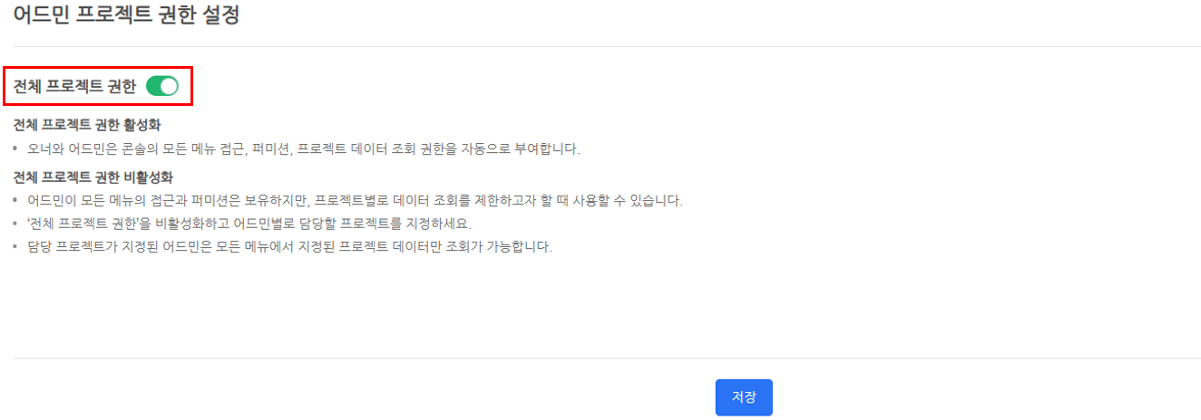어드민이 모든 메뉴의 접근과 퍼미션은 보유하지만, 회사의 정책에 따라 어드민이 프로젝트의 개별 관리자로서 운영하고 싶다면, ‘전체 프로젝트 권한’을 OFF로 변경 후 어드민의 담당 프로젝트를 설정할 수 있습니다. 담당 프로젝트가 지정된 어드민은 콘솔 모든 메뉴에서 지정된 프로젝트 데이터만 조회할 수 있습니다.