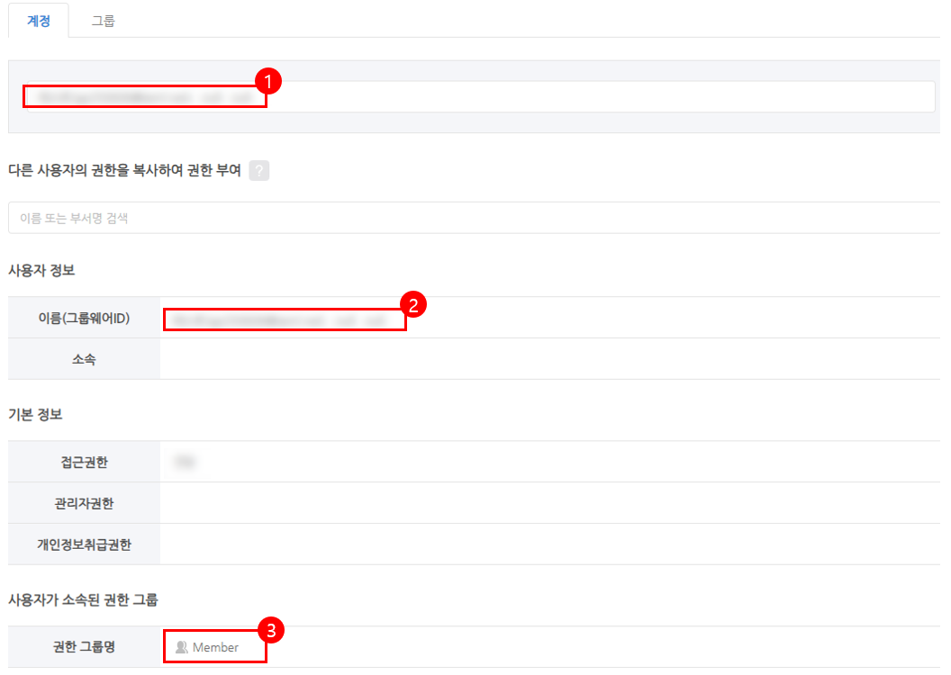 [3] ‘[1]’에서 검색한 멤버에게 부여된 그룹 권한을 확인할 수 있습니다.