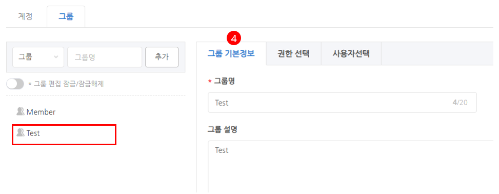 [4] 그룹 기본 정보 : 선택한 권한 그룹의 기본 정보를 수정할 수 있습니다.