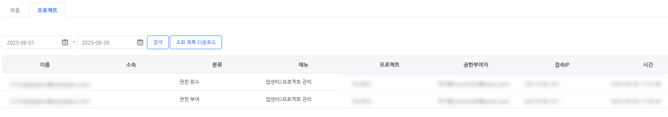 계정 기준으로 지급된 프로젝트의 권한 부여 및 회수 이력을 조회할 수 있습니다.