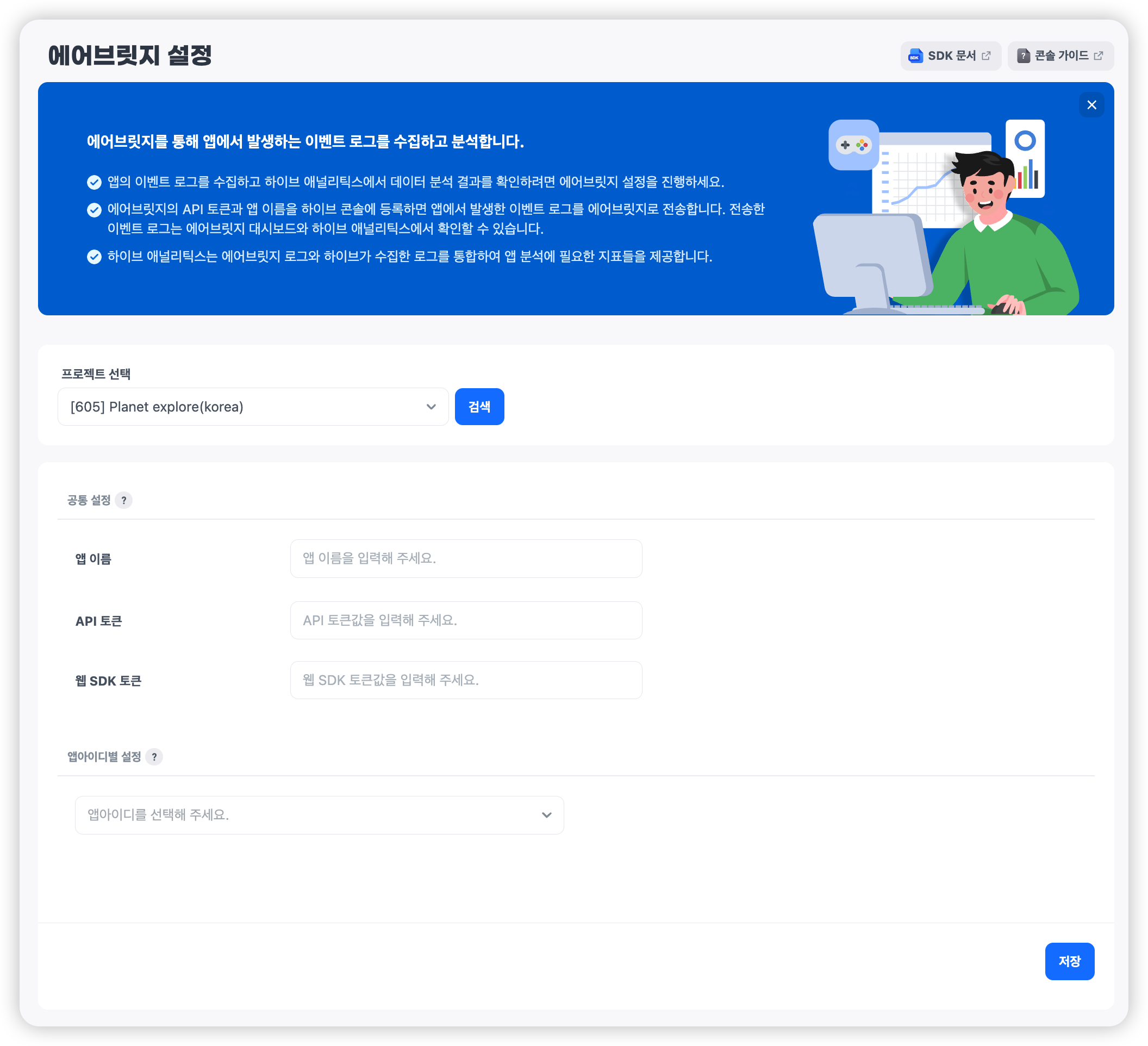 - API 토큰 : PC 앱에서 발생한 이벤트 로그를 수집하기 위한 토큰 정보입니다. 또한 Hive 애널리틱스에서 모바일/PC 이벤트 데이터를 수집하고 지표를 제공하는데 활용됩니다.