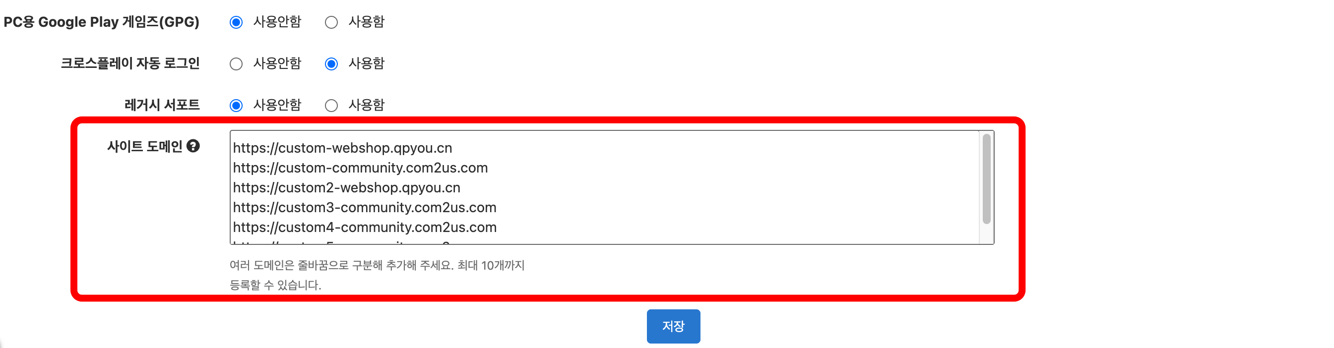 - '콘솔>앱센터>프로젝트 관리>Hive 제품 설정>사이트 도메인'에서 자동 로그인을 지원할 웹사이트의 도메인을 등록합니다.