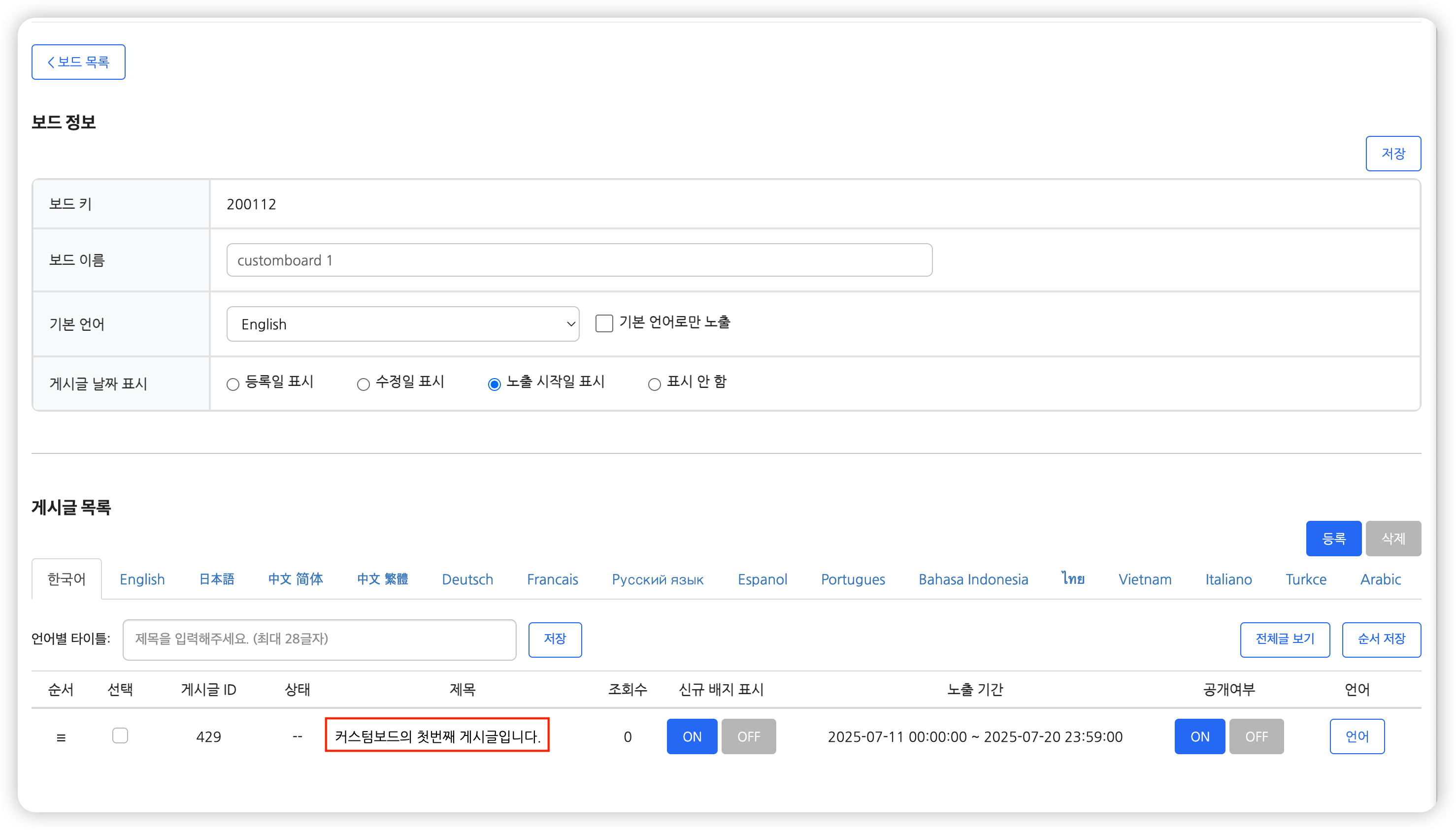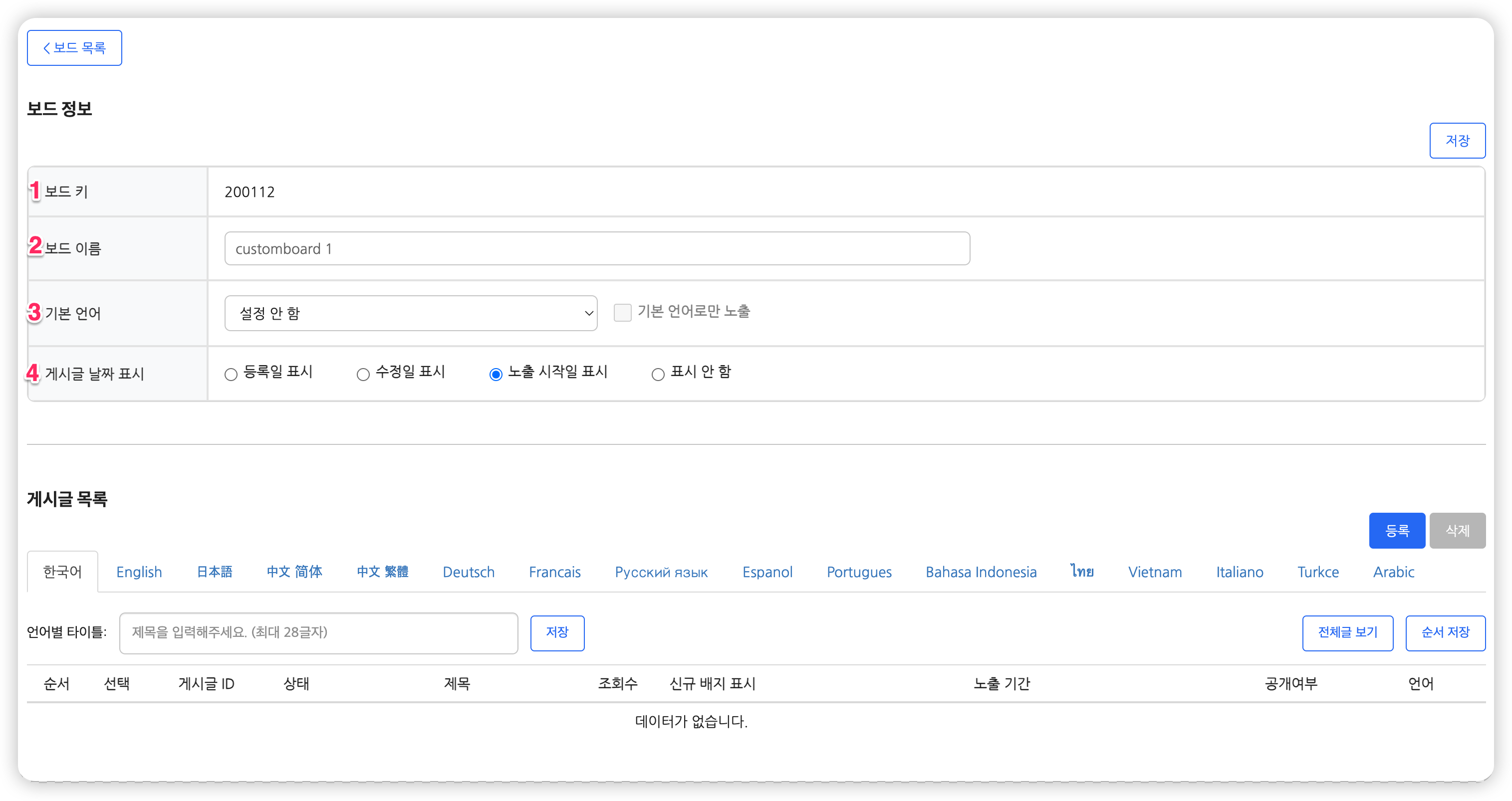 - 커스텀 보드 게시글은 내용을 입력한 언어값에서만 노출됩니다. 만약 모든 언어에서 게시글을 노출하고 싶으시다면 기본 언어 기능을 사용할 수 있습니다.