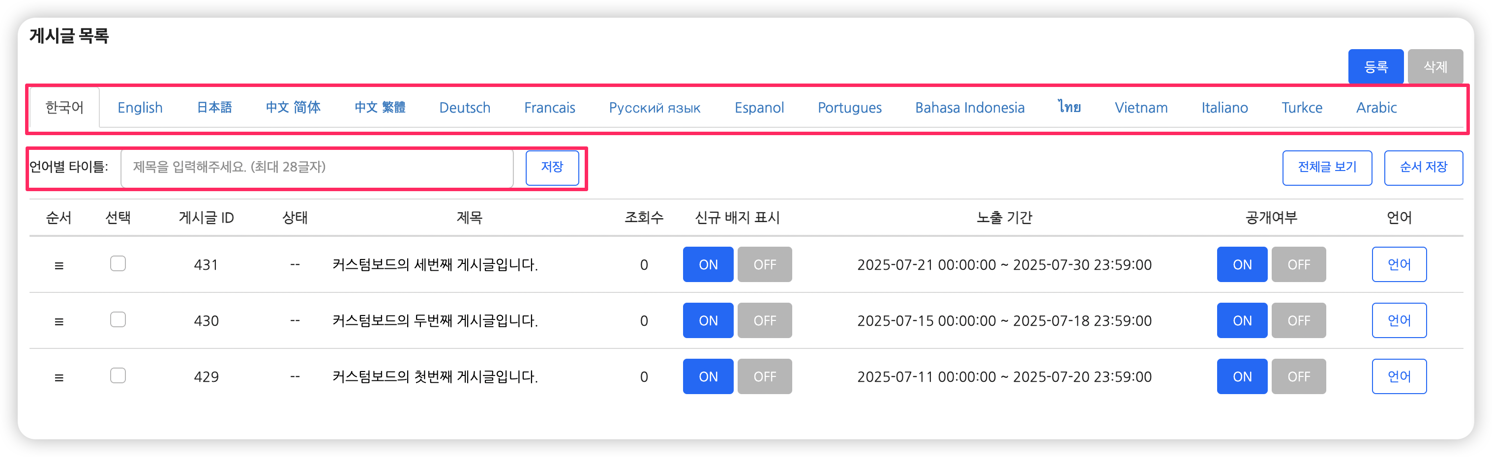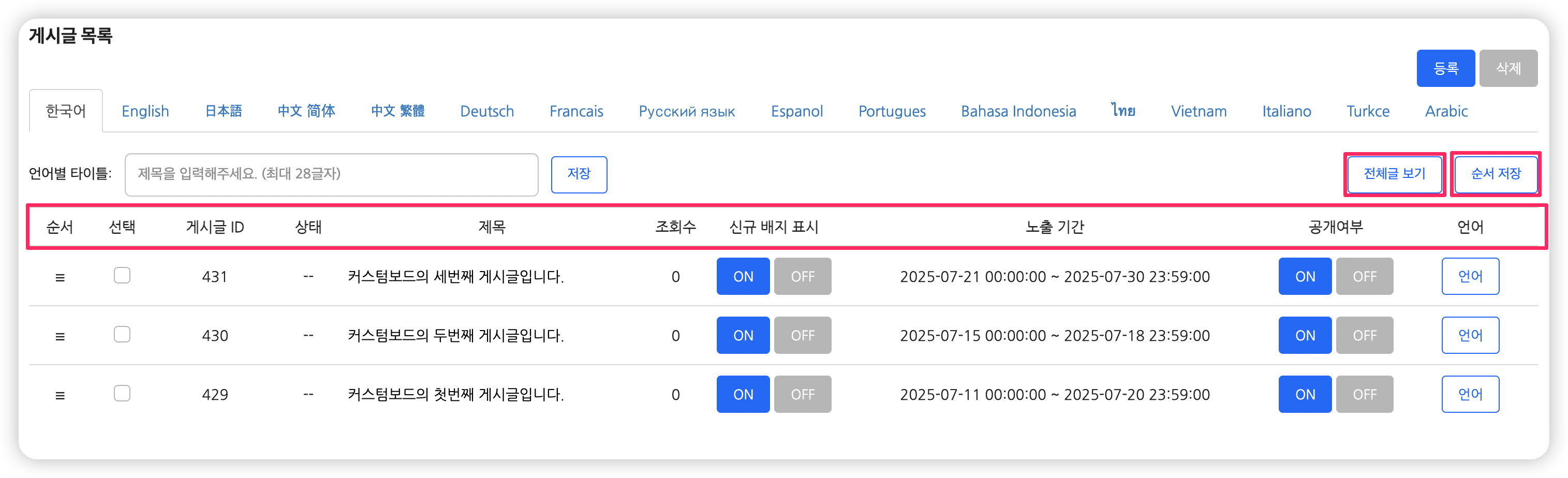 - 순서 : 해당 아이콘을 드래그앤드랍하여 게시글 순서를 변경합니다.