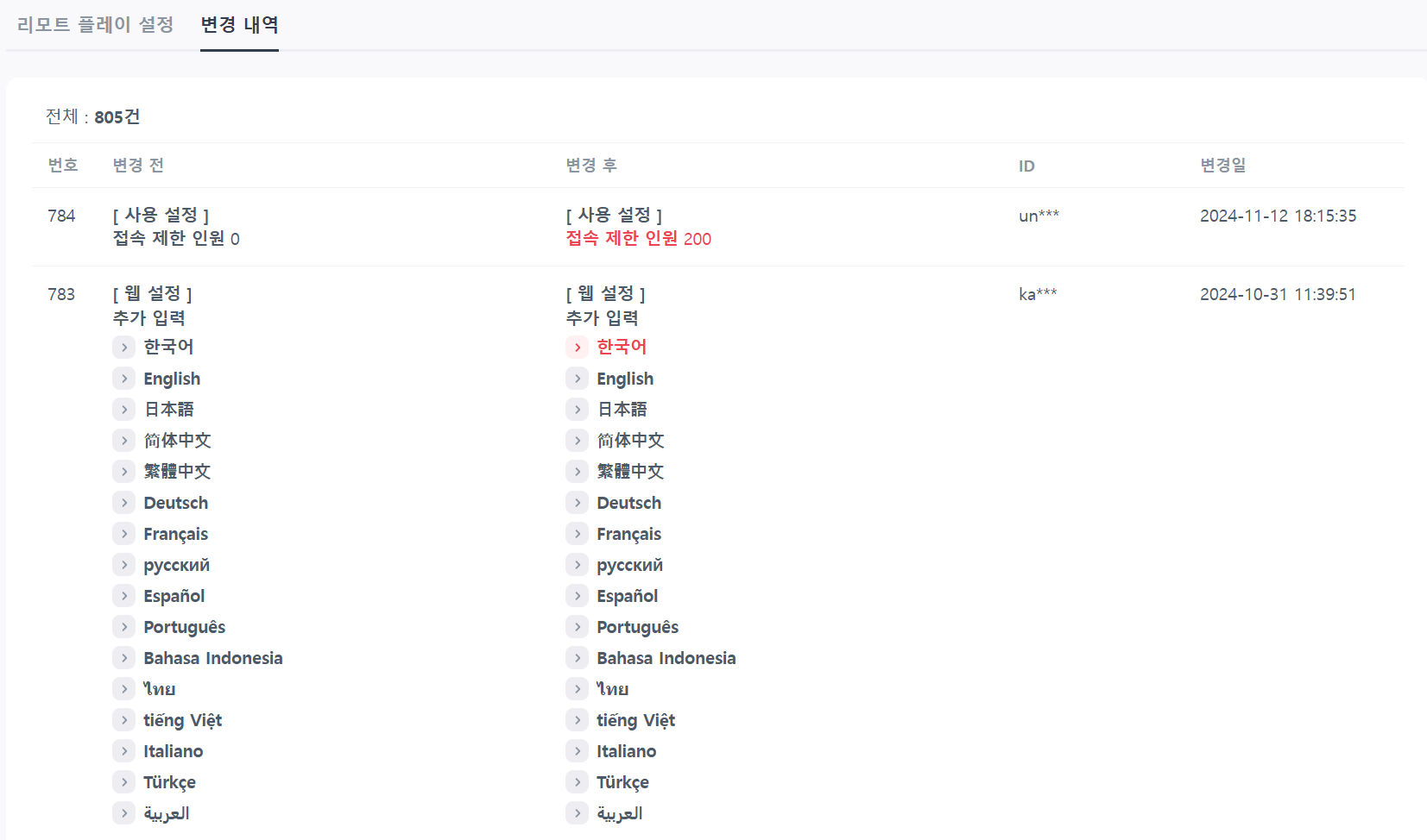 리모트 플레이 설정에서 내용을 수정하거나 등록 후 저장을 클릭하면 수정 전과 후의 내용을 모두 자동으로 기록합니다. 변경 내역을 확인하여 히스토리를 파악할 수 있습니다.