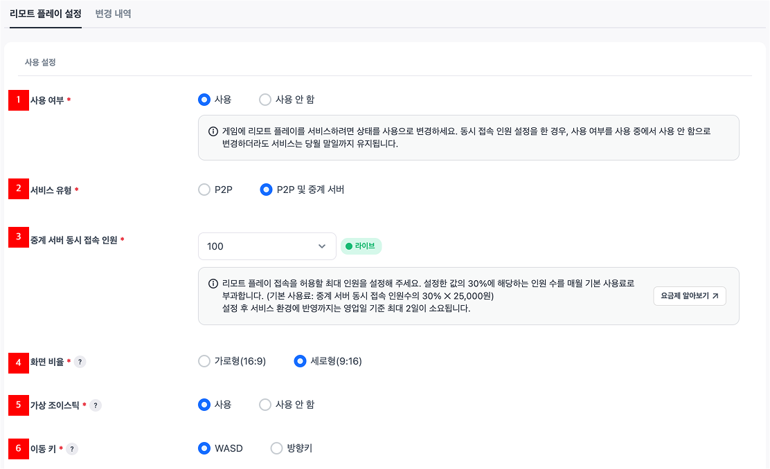 - 서비스 종료 기준 : 리모트 플레이 사용 안 함, 프로젝트 상태 값 서비스 종료, 동시 접속 인원 0(단 리모트 플레이가 사용 설정이고 동시 접속 인원만 0으로 변경할 경우 웹 사이트는 유지됨)