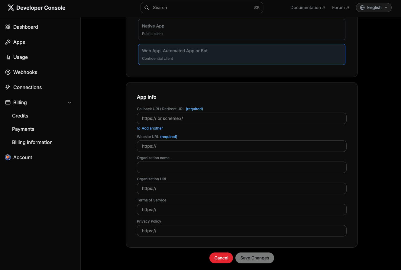 - ลงชื่อเข้าใช้ X Developer Console และไปที่หน้าของแอป