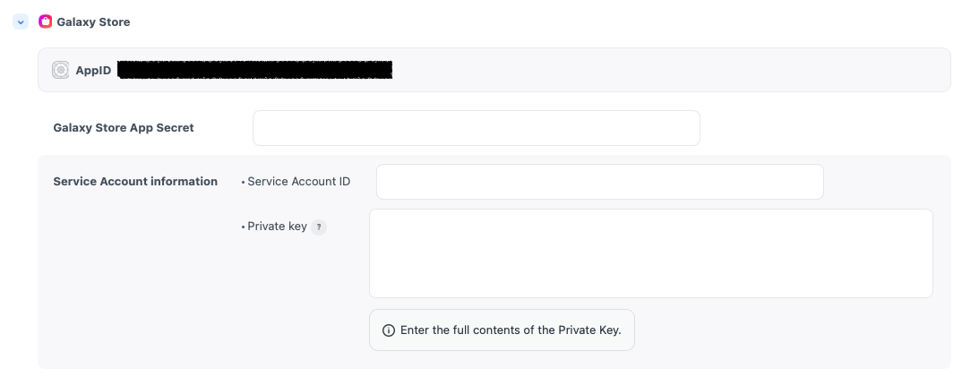 - ข้อมูลบัญชีบริการ : หาก SDK เวอร์ชันที่ใช้คือ 26.1.0 หรือใหม่กว่า คุณต้องป้อนข้อมูลบัญชีบริการเพื่อขายผลิตภัณฑ์ที่สมัครสมาชิก คุณสามารถค้นหาข้อมูลบัญชีบริการได้ใน Galaxy Store Console ตรวจสอบข้อมูลบัญชีบริการใน คู่มือ Galaxy Store แล้วป้อนข้อมูลนั้น