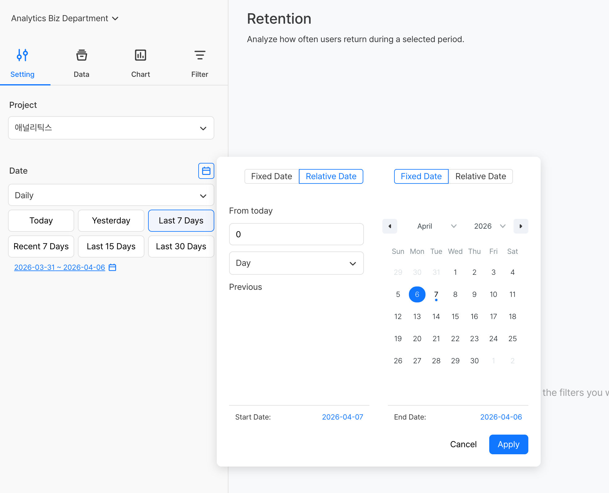 - ในแท็บ [การตั้งค่า] กำหนดโปรเจกต์ ช่วงเวลา (รายวัน/รายสัปดาห์/รายเดือน) และช่วงวันที่ที่จะวิเคราะห์