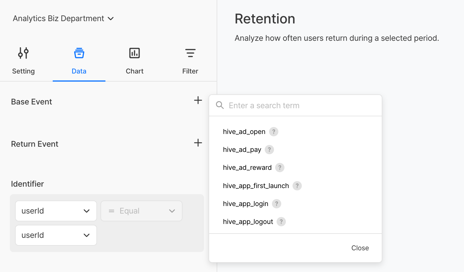 | อีเวนต์กลับมาใช้งาน | อีเวนต์ที่ใช้วัดรีเทนชัน ติดตามว่าผู้ใช้ในโคฮอร์ตเกิดอีเวนต์นี้ภายหลังหรือไม่ |