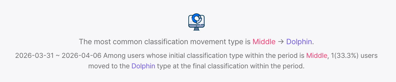 - สามารถดูเป็นตัวเลขว่าผู้ใช้หลุดออกอย่างไร เช่น ผู้ใช้คุณค่ามาก→ผู้ใช้ปลาโลมา หรือ ผู้ใช้เบา→ไม่เข้าใช้งาน ภายในช่วงที่เลือก เพื่อใช้ตัดสินใจจังหวะของแคมเปญดึงกลับ