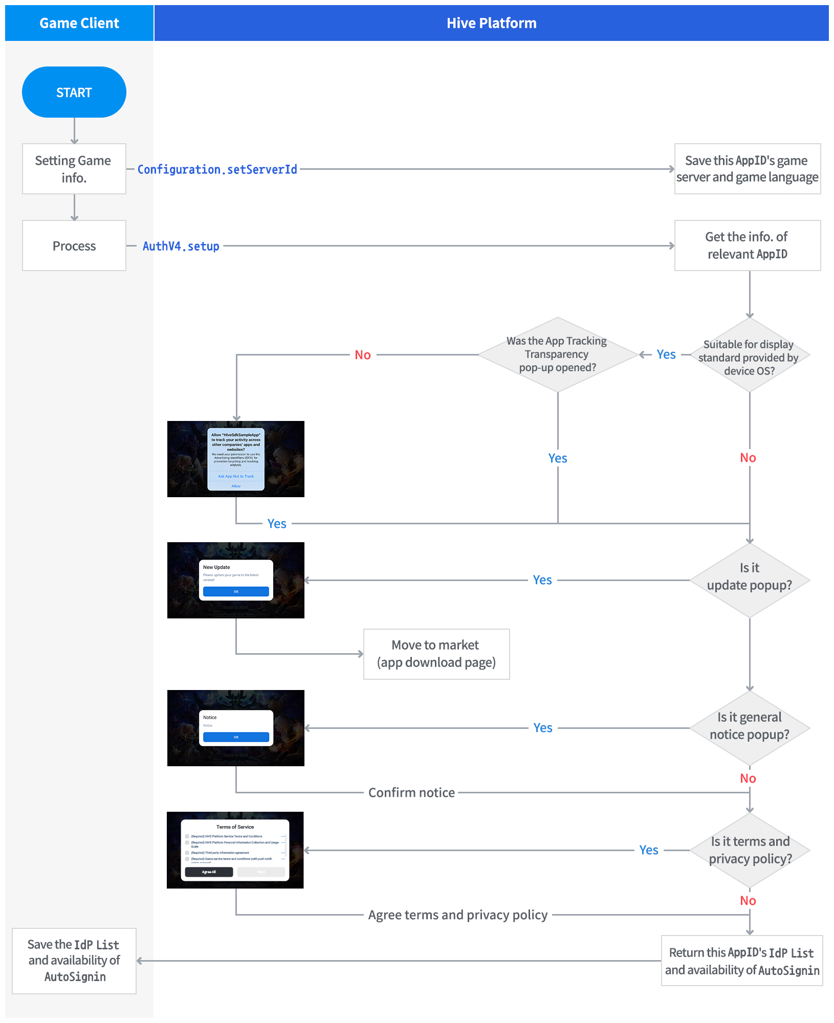 ในการเริ่มต้น SDK Hive ให้เรียกใช้ AuthV4.setup แนะนำให้ทำการเริ่มต้น หลังจากที่แอปทำงานและโลโก้บริษัท (CI) แสดงผล หาก result.isSuccess ที่ได้รับเป็นผลลัพธ์ของการเรียกกลับเป็น True การเริ่มต้นจะสำเร็จ นี่คือตัวอย่างโค้ด