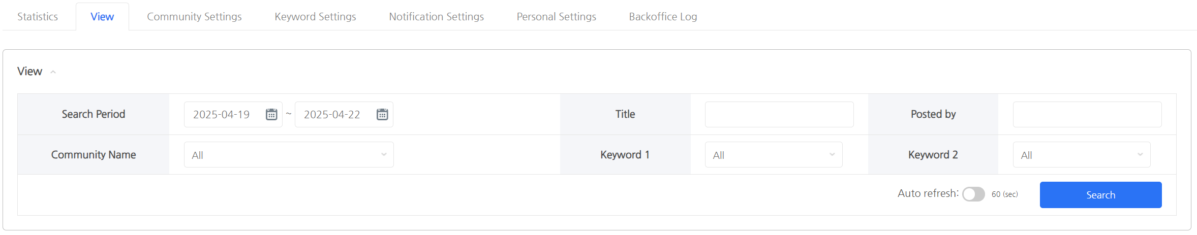 - รายการการแจ้งเตือนคำหลัก: คุณสามารถดูการแจ้งเตือนชื่อชุมชน, ประเภทชุมชน, ชื่อเรื่อง, คำหลักและลิงก์ในช่วงเวลาที่เลือก คุณสามารถค้นหารายการโดยตั้งค่าเงื่อนไขในแท็บ "ดู" ในเมนู