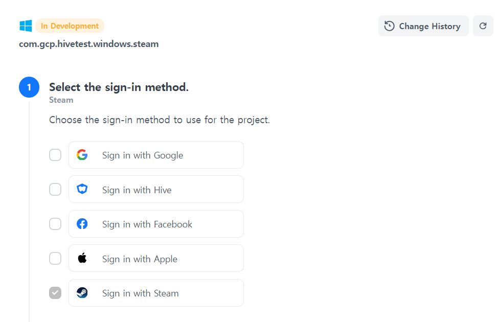 PC (Windows, MacOS): IdP ที่รองรับ ได้แก่ Hive, Google, Facebook และ Apple หาก App ID ถูกตั้งค่าเป็นตลาด Steam ใน App Center การ "ลงชื่อเข้าใช้ด้วย Steam" เป็นสิ่งจำเป็น