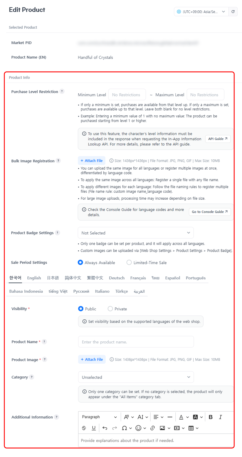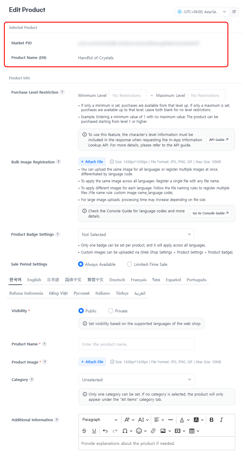 ฟิลด์ผลิตภัณฑ์ต้องซิงค์กับ Market PID ที่ลงทะเบียนใน Billing หลังจากซิงค์แล้ว ให้ลงทะเบียนข้อมูลผลิตภัณฑ์ที่ละเอียด