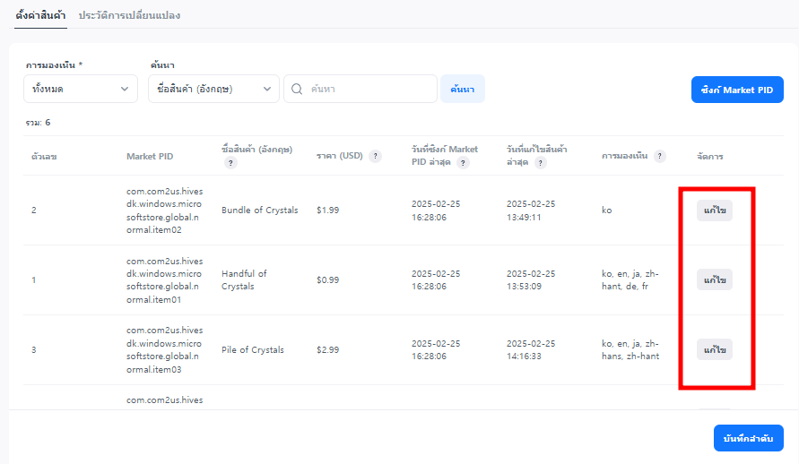 คลิกที่ปุ่ม 'ลงทะเบียน' หรือ 'แก้ไข' ในส่วน Market PID เพื่อป้อนข้อมูลผลิตภัณฑ์โดยละเอียด