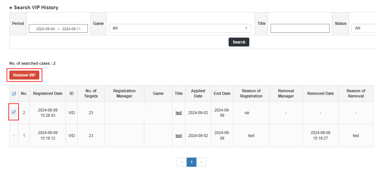 - เลือกข้อมูลการลงทะเบียนที่จะลบจากรายการ VIP ในตารางค้นหา