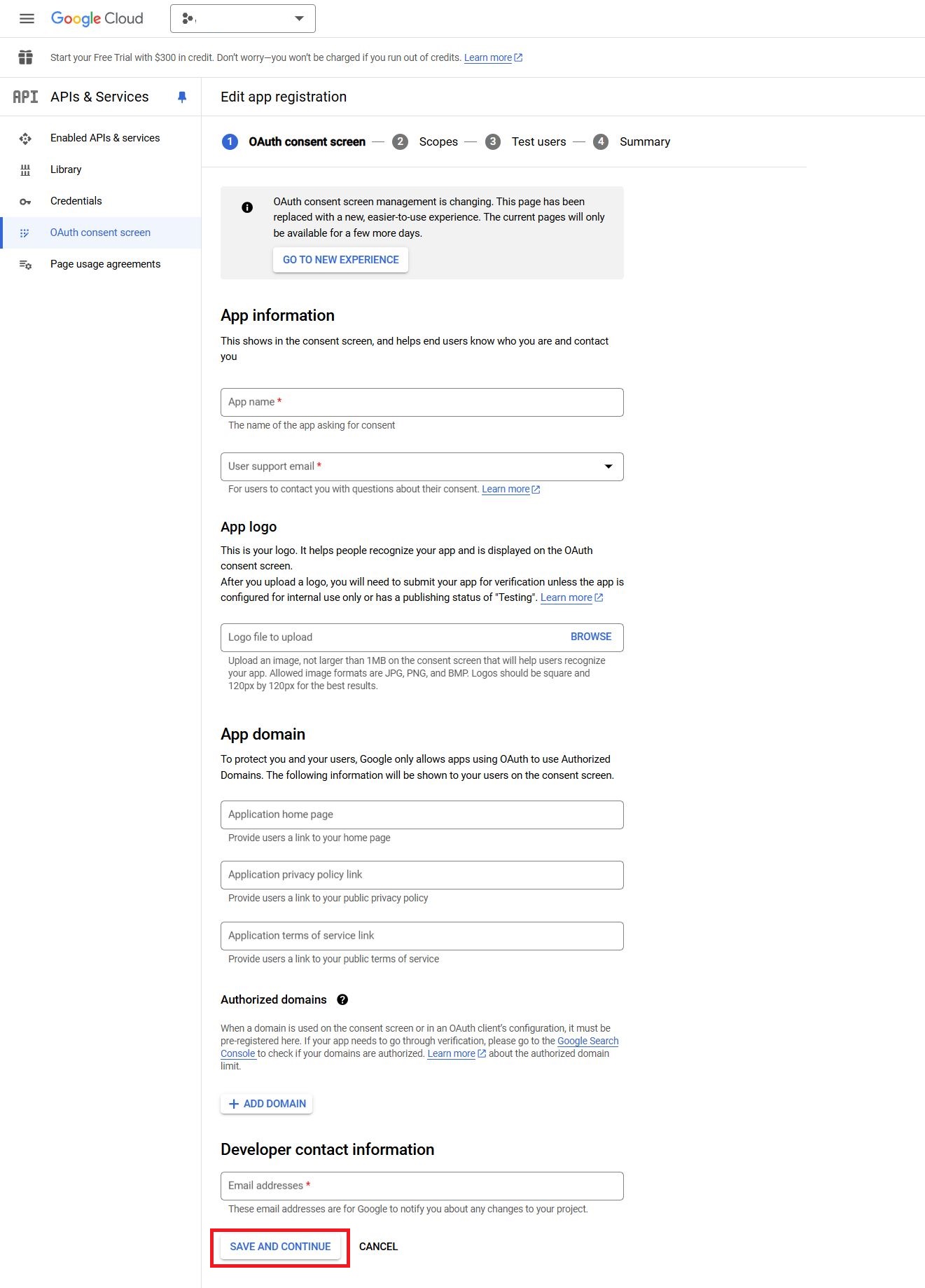 - คลิก Save and Continue โดยไม่ตั้งค่าขอบเขตเพิ่มเติม.
