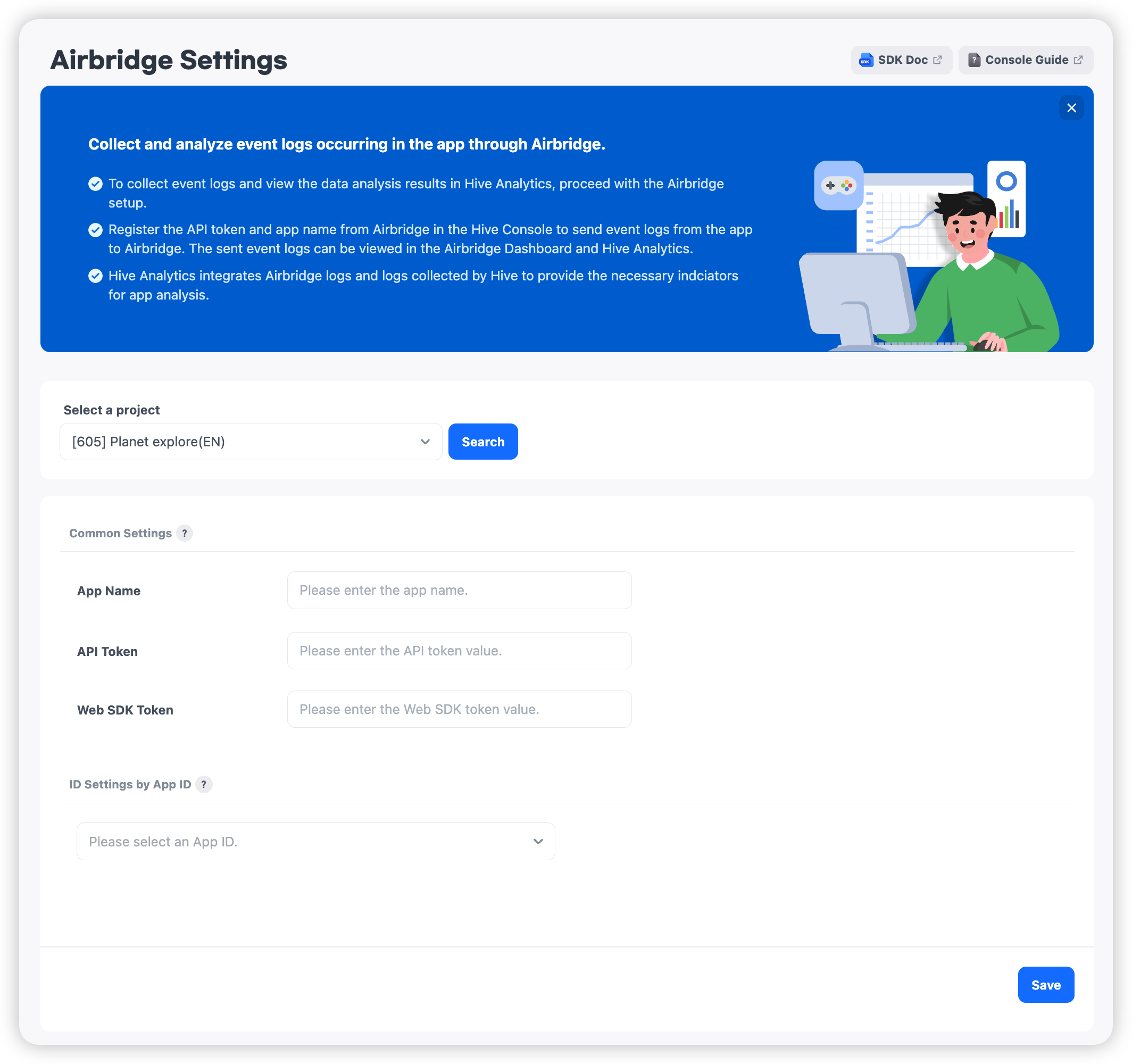 โดยการลงทะเบียนชื่อแอปและข้อมูลโทเค็นจาก Airbridge ใน Hive Console บันทึกเหตุการณ์จากแอปและเว็บจะถูกส่งไปยัง Airbridge บันทึกเหตุการณ์ที่ส่งสามารถดูได้ใน Airbridge Dashboard และ Hive Analytics.