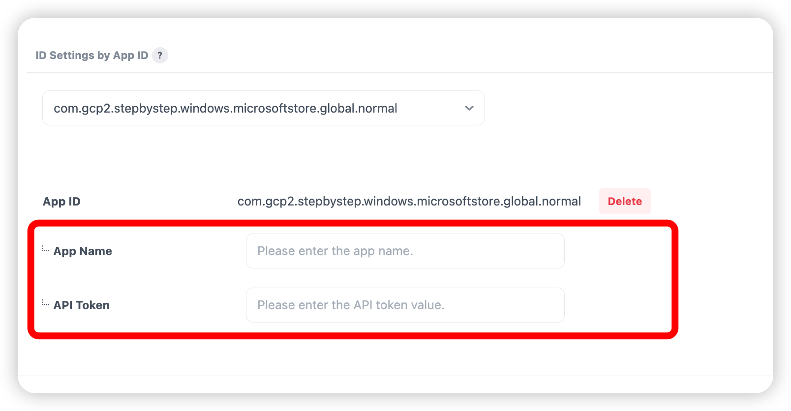 ป้อนข้อมูลที่จำเป็นสำหรับ App ID ที่เลือก