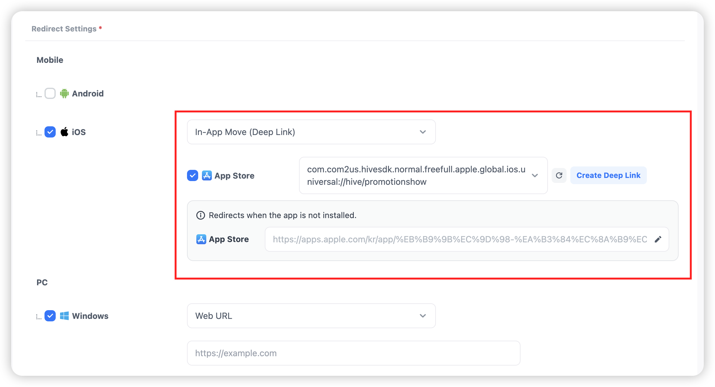 - การเปลี่ยนเส้นทางตลาดสำหรับผู้ใช้ที่ไม่ได้ติดตั้ง: ผู้ใช้ที่ไม่มีแอปติดตั้งจะถูกเปลี่ยนเส้นทางไปยัง 'URL เปลี่ยนเส้นทางสำหรับผู้ใช้ที่ไม่ได้ติดตั้ง' ที่กำหนดไว้ในคอนโซล URL นี้สามารถเป็นลิงก์ตลาดหรือลิงก์เว็บเพจเฉพาะได้