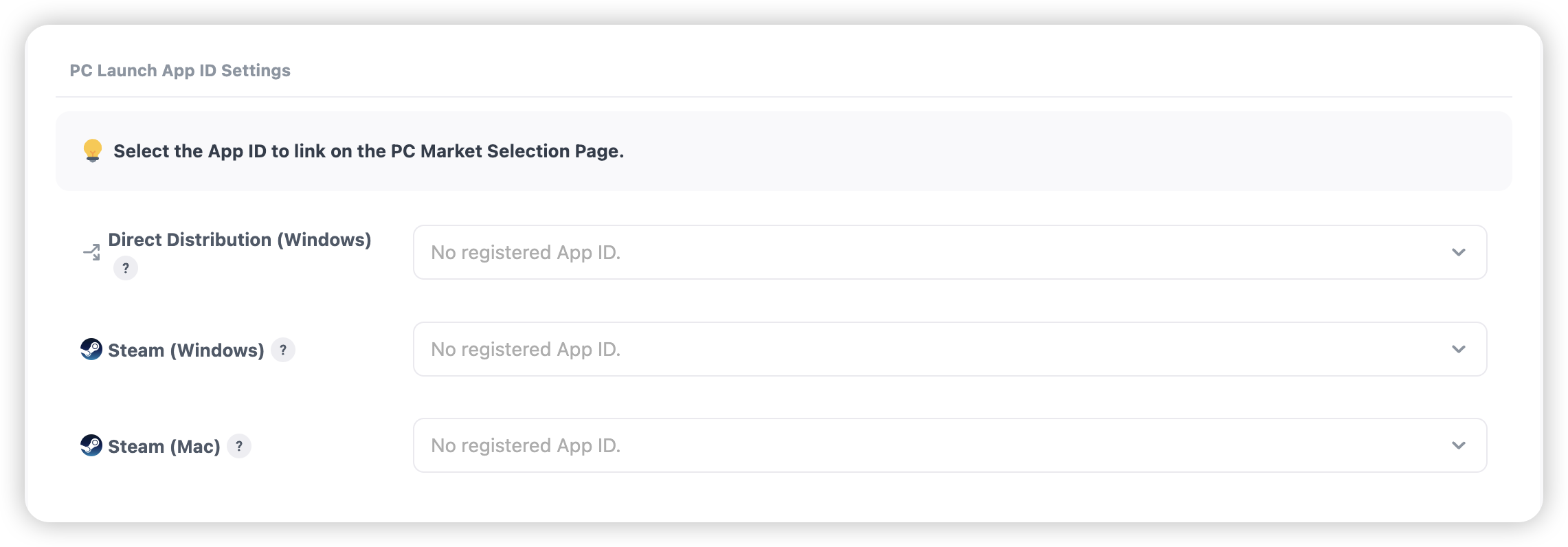 - Windows, Mac: เลือกตลาดเพื่อแสดงปุ่มบนหน้าเลือกตลาด PC หน้าเว็บนี้ทำงานตามการตั้งค่า 'PC App ID for Launch' ในแท็บ 'การจัดการลิงก์ตรง > การตั้งค่า' อนุญาตให้ผู้ใช้ติดตั้งและเปิดแอป (ดูภาพ)