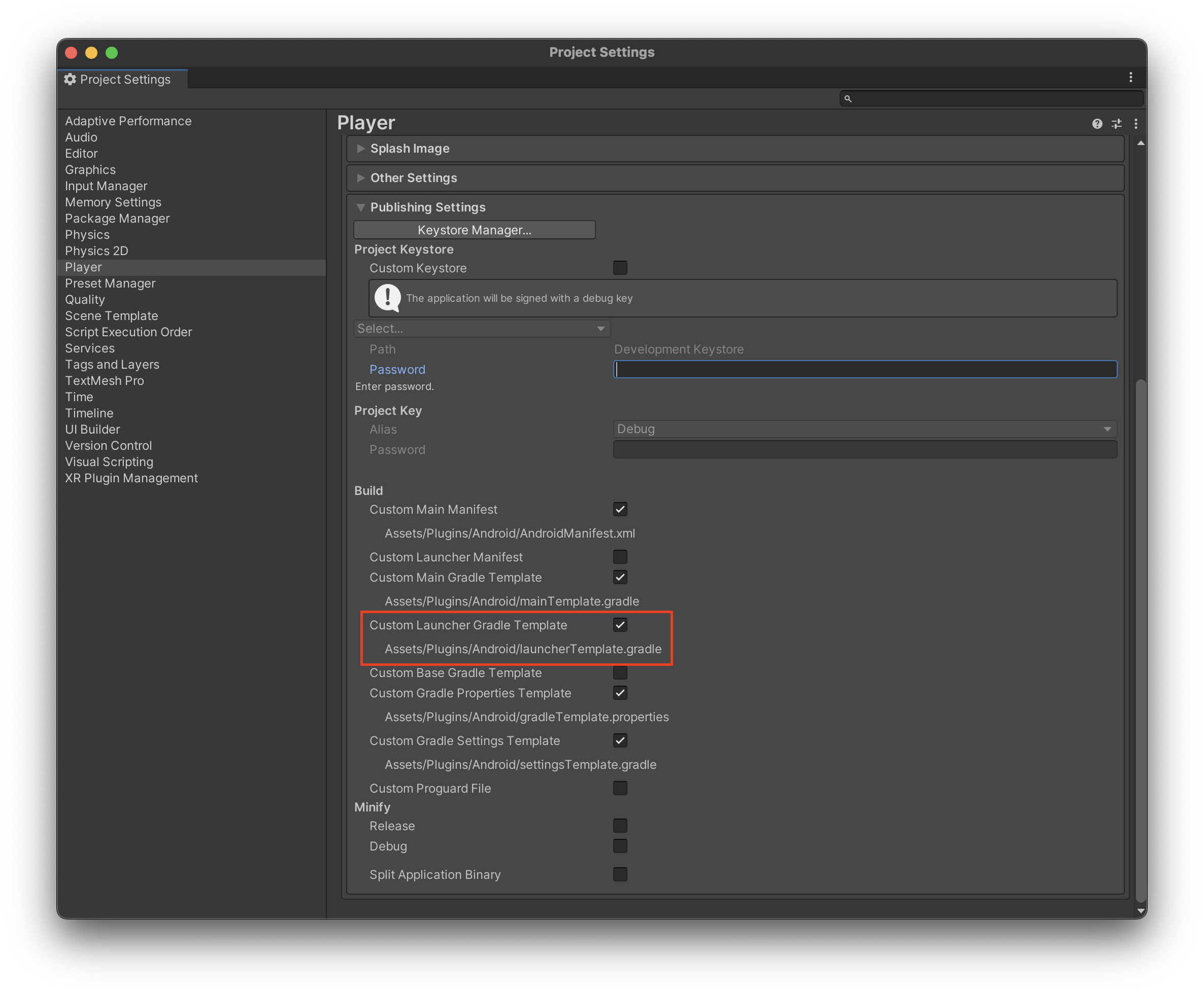 1. สร้าง launcherTemplate.gradle การตั้งค่าโปรเจกต์ > ผู้เล่น > การตั้งค่าการเผยแพร่ > ตรวจสอบ Custom Launcher Gradle Template ในส่วนการสร้าง