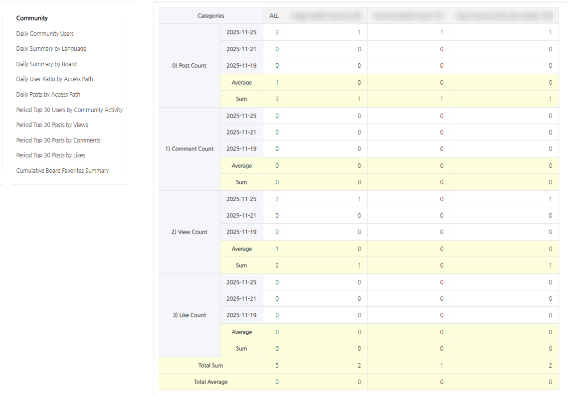 ดูข้อมูลคอมมูนิตี้ได้ที่เมนู [การวิเคราะห์ > ตัวบ่งชี้เกม > คอมมูนิตี้] เครื่องมือวิเคราะห์จะใช้สถิติที่มีอยู่แล้วเป็นตัวชี้วัดในการวิเคราะห์ เช่น DAU (ผู้ใช้งานรายวัน) และ NU (ผู้ใช้งานใหม่) และช่วยให้คุณดูได้ทั้งข้อมูลโดยรวมและรายละเอียดในระดับบอร์ด รายละเอียดในระดับบอร์ดประกอบด้วยจำนวนโพสต์, คอมเมนต์, ยอดเข้าชม และจำนวนการกดถูกใจ (Like) ของแต่ละบอร์ด