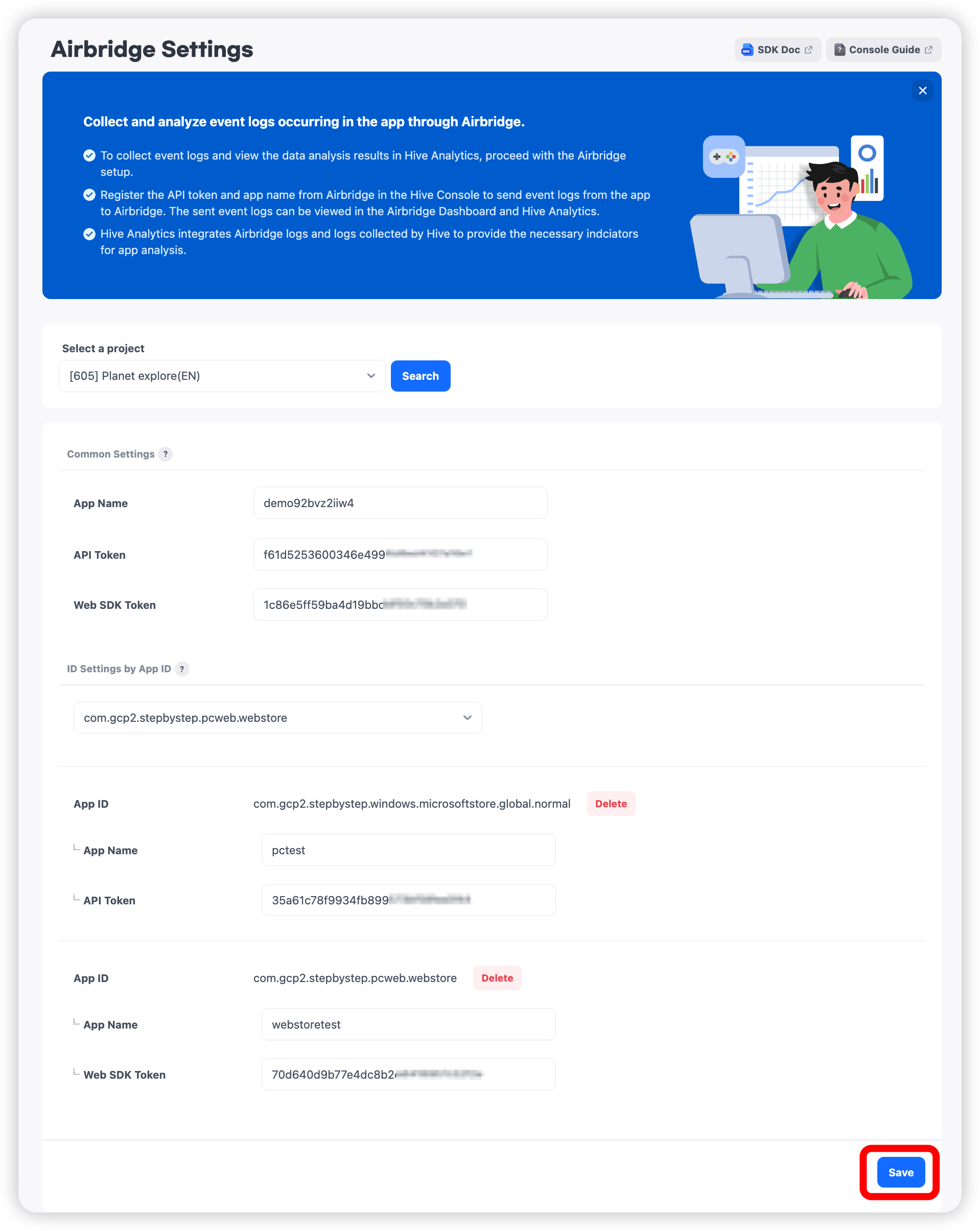 3. วางค่าที่คัดลอกในฟิลด์ชื่อแอป, API Token, และ Web SDK Token. airbridge_setting_0