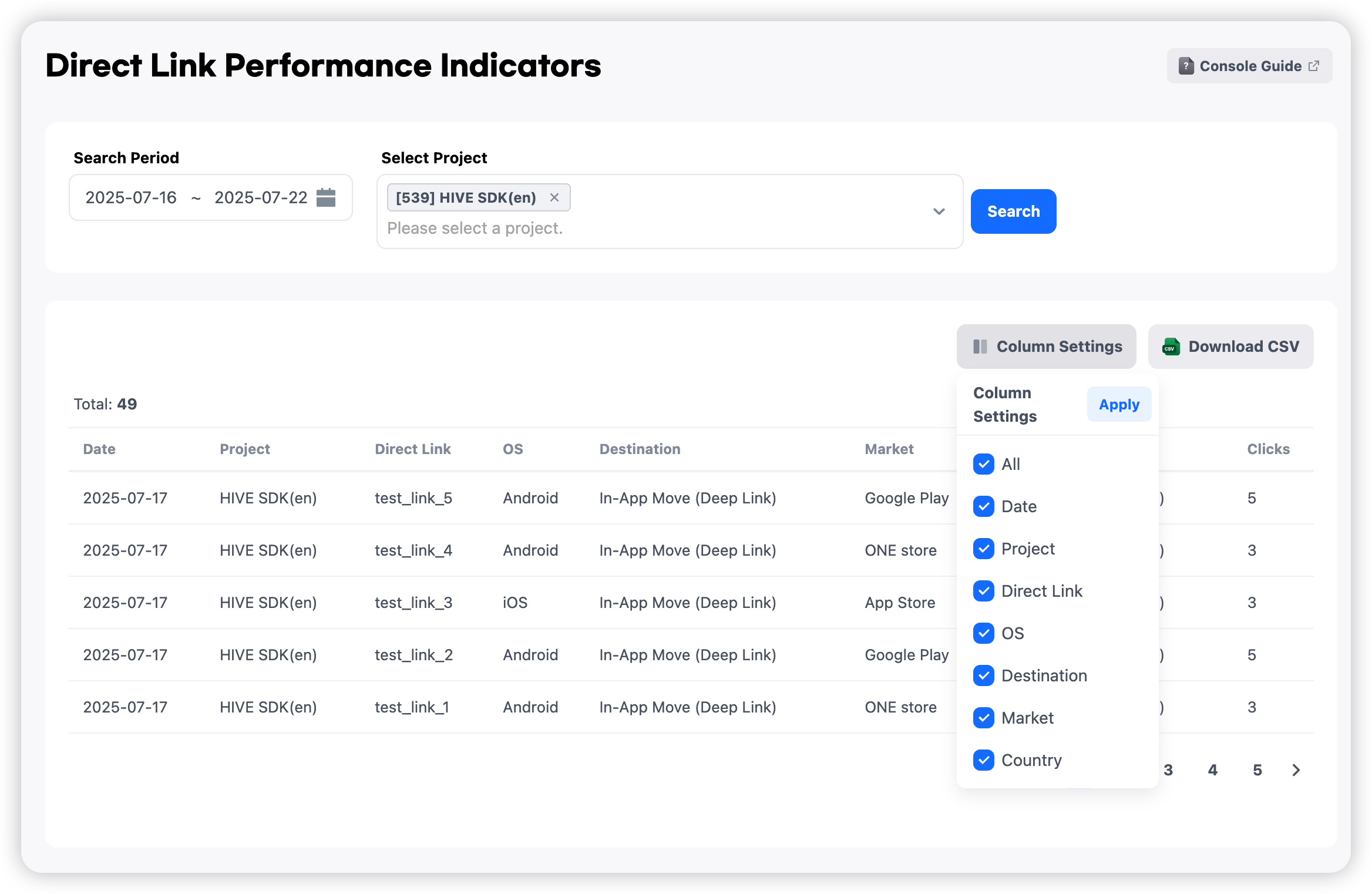 ไปที่ 'คอนโซล > โปรโมชั่น > การมีส่วนร่วมของผู้ใช้ > ตัวชี้วัดประสิทธิภาพลิงก์ตรง'。 ให้ข้อมูลรายละเอียดเกี่ยวกับผู้ใช้ที่คลิกที่ลิงก์ตรง ตรวจสอบจำนวนการคลิกตาม OS, ประเทศ, ภาษา และจุดหมายปลายทางสุดท้าย (ตลาด, สถานที่ในแอป, URL เว็บ เป็นต้น)
